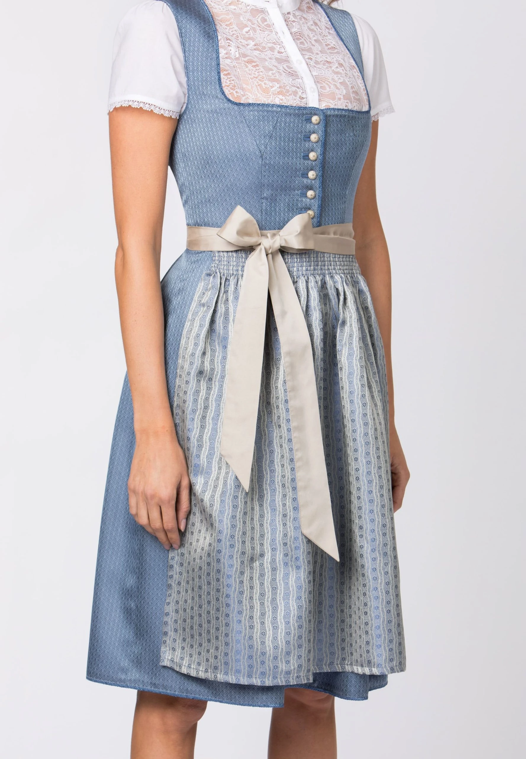 Dirndl Irit von Heimatgwand in rauchblau. Das Modell besticht durch den Münchner Schnitt und ist mit liebevollen Details versehen. Das Mieder ist aus einem hochwertigen, gemusterten Jacquardstoff gefertigt und mit floralen Trachtenknöpfen versehen. Traditionelle Akzente setzt die geschmackvolle Dirndlschürze mit farblich abgestimmtem Schürzenband. Ein perfekter Begleiter zu vielen Festen. Unser Model trägt die Dirndlbluse Lyla in weiß.