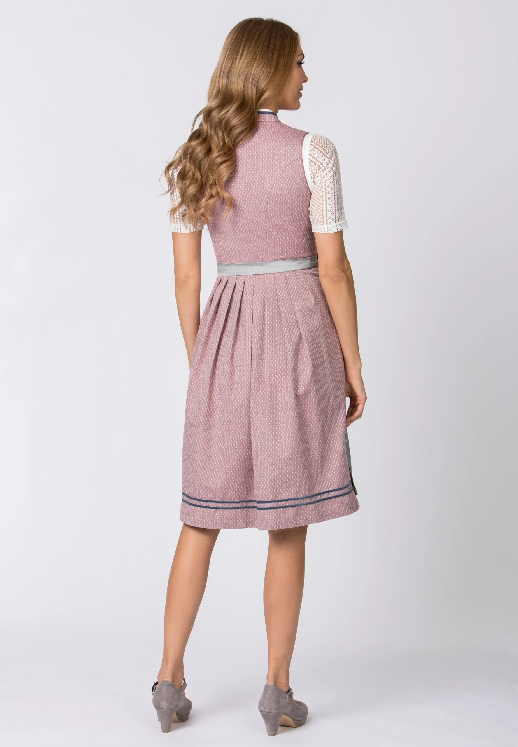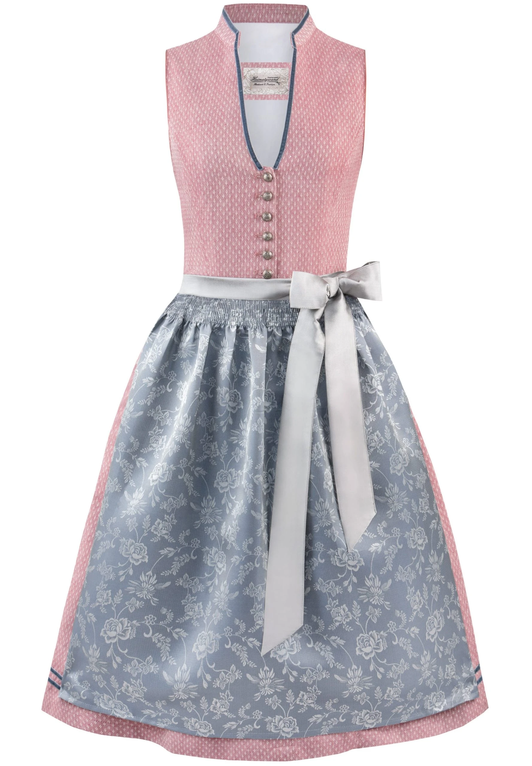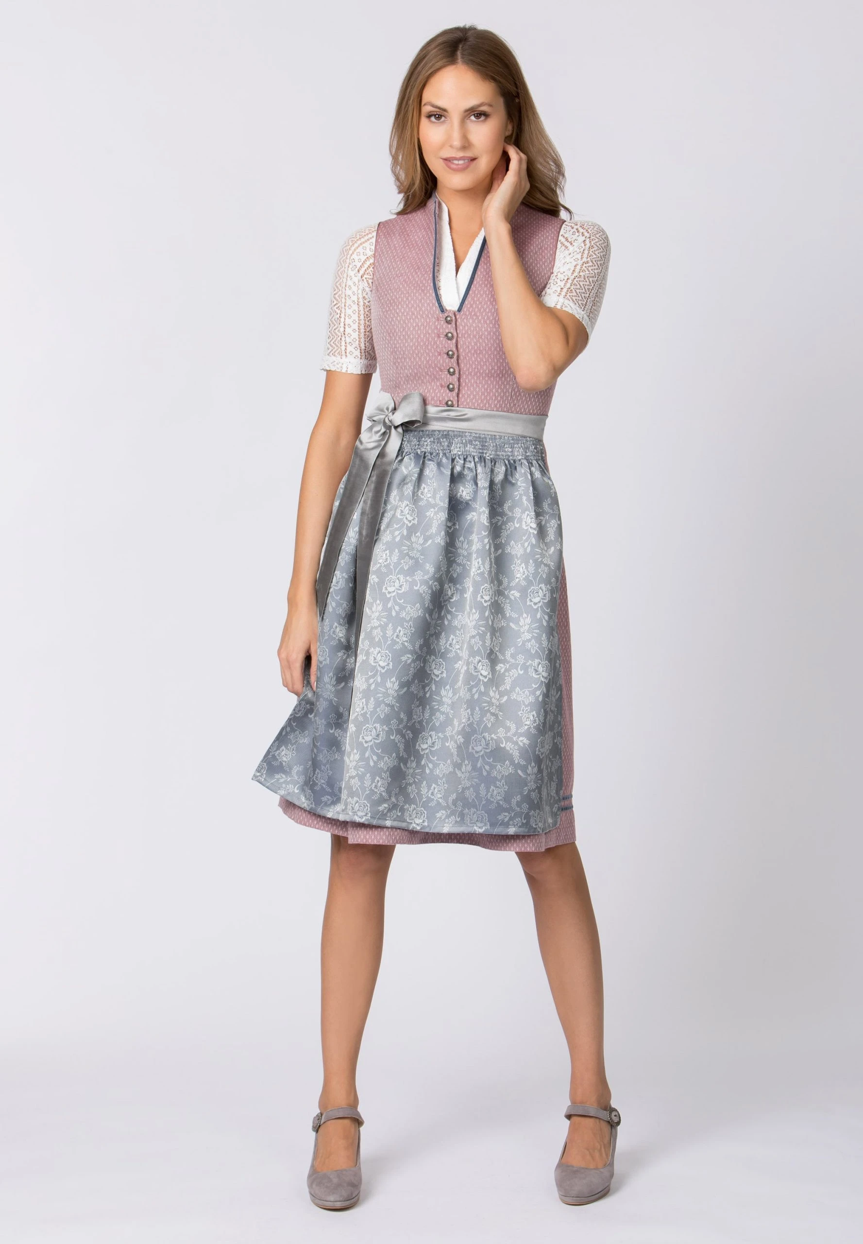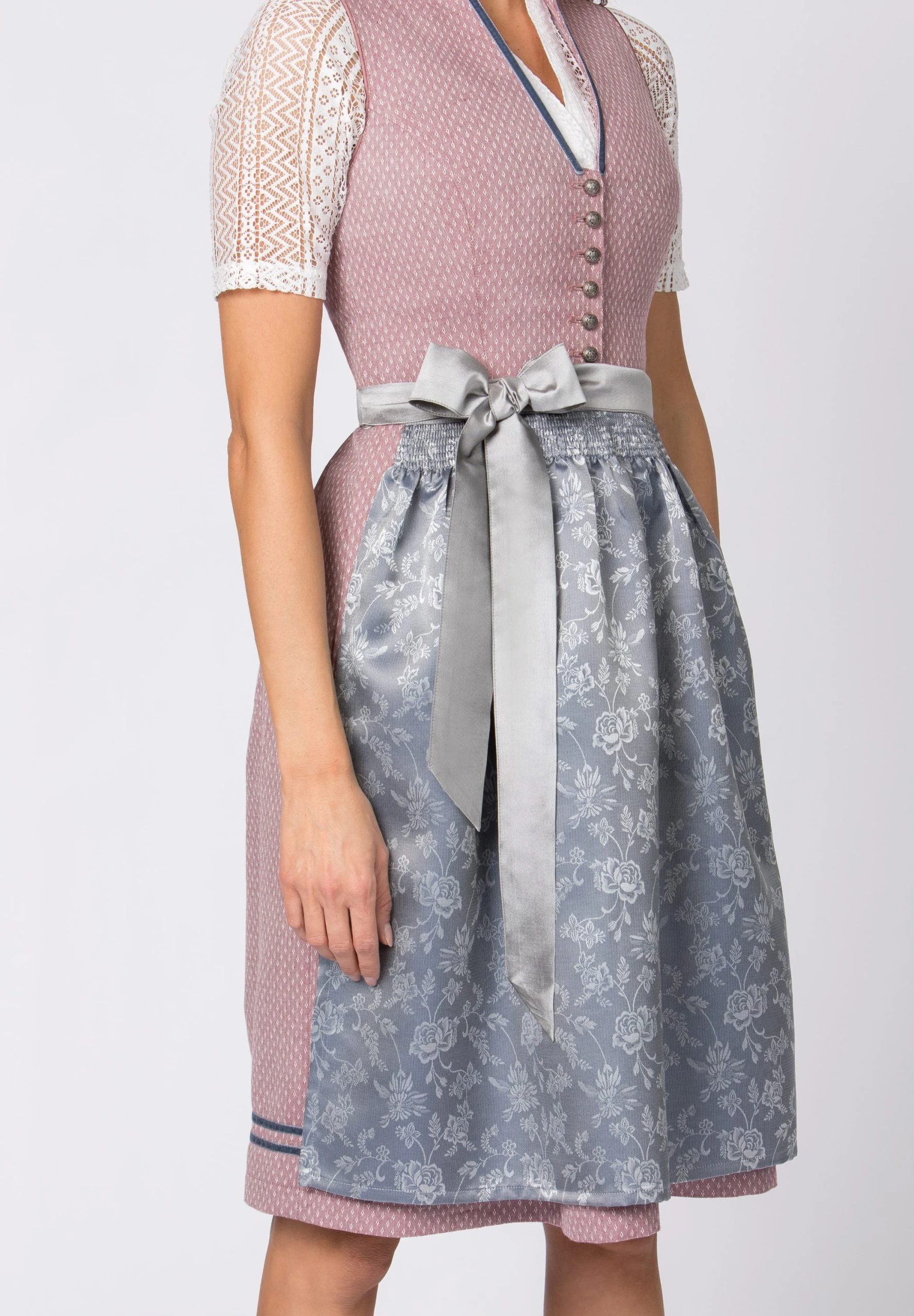 Dirndl Thalina von Heimatgwand in rose. Das Dirndl überzeugt durch die gekonnt abgestimmte Farbharmonie. Der hochgeschlossene Schnitt mit einem angesetzten Stehkragen macht das Modell zum absoluten „must have“. Das feine Samtband am Ausschnitt und am Rock nehmen das Farbspiel erneut auf. Die geblümte Jacquardschürze mit einfarbigem Schürzenband rundet das Gesamtbild perfekt ab. Ein erstklassiger Begleiter auf vielen Festlichkeiten. Unser Model trägt Dirndlbluse Elsa in creme.