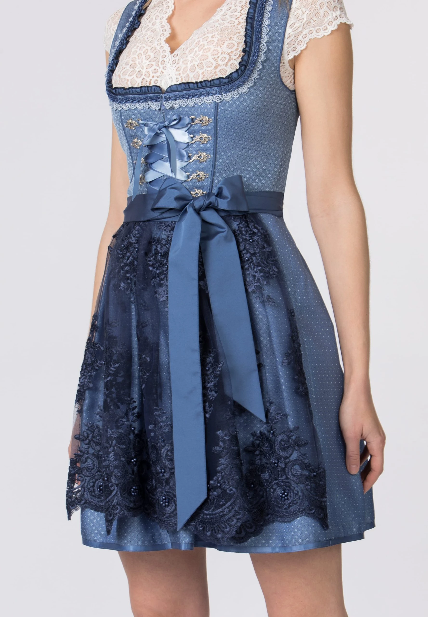 Dirndl Beliva mit Spitzenschürze für Damen von Wiesnwuid in blau. Das geschmackvolle Dirndl begeistert durch das ansprechende Jacquard Muster und ist mit bezaubernden Details versehen. Für die feminine Note sorgen die eingearbeiteten Rüschen am Dekolleté, die aufgenähten Zierborten sowie die verzierten Miederhaken. Die Schnürung mit den zwei verschieden farbigen Satinbändern unterstreicht den femininen Look. Durch die romantische, farblich abgestimmte Spitzenschürze wird das Gesamtbild gekonnt abgerundet. Kombipartner: Dirndlbluse Jasmin in weiß.