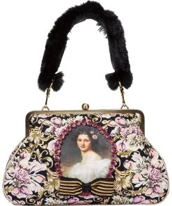 Aus Wiesnkönig’s Zinnober Kollektion: Wiesnkönig’s Bügeltasche Auguste mit Kugelverschluss ist aus pink-schwarzem Gobelinstoff. Ein Bild aus der Schönheitengalerie umrahmt mit einer Rosenborte und gold-schwarzen Schleife ziert die Vorderseite. Abnehmbare und somit austauschbar ein Schulterriemen und ein Henkel gehören zu dieser Tasche. Das Innenfutter aus pinkfarbener Wildseide und zwei Innentaschen machen die Tasche zu einem hübschen und praktischen Begleiter.